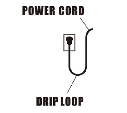 A "drip loop", shown in the figure, should be arranged for each cord connecting the light to the receptacle. The "drip loop" is the part of the cord below the level of the receptacle, or the connector. If the plug or receptacle does get wet, DO NOT unplug the cord. Disconnect the fuse to the circuit breaker that supplies power to the light. Then unplug and examine for the presence of water in the receptacle.
